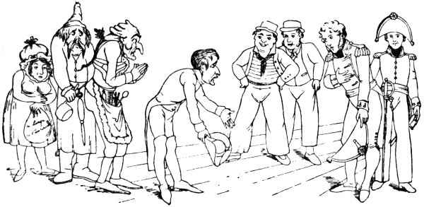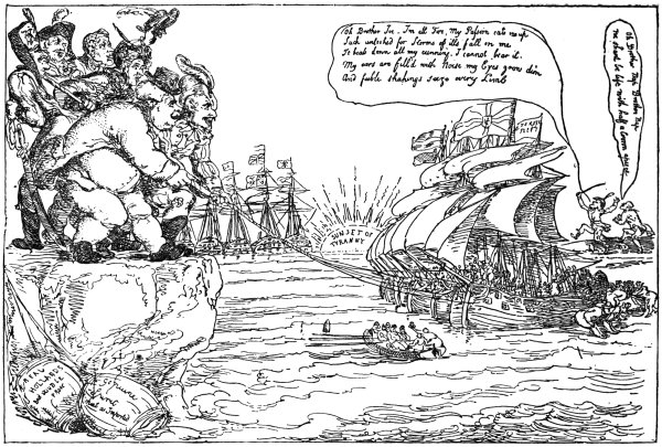 One of the most singular caricatures, in connection with the projected invasion, that I have met with is by Ansell, January 6, 1804. ‘The Coffin Expedition, or Boney’s Invincible Armada Half seas over.’ The flotilla is here represented as gunboats, in the shape of coffins: all the crews, naval and military, wearing shrouds; whilst at the masthead of each vessel is a skull with bonnet rouge. It is needless to say they are represented as all foundering, one man exclaiming, ‘Oh de Corsican Bougre was make dese Gun boats on purpose for our Funeral.’ Some British vessels are in the mid distance, and two tars converse thus: ‘I say Messmate, if we dont bear up quickly, there will be nothing left for us to do.’ ‘Right, Tom, and I take them there things at the Masthead to be Boney’s Crest, a skull without brains.’