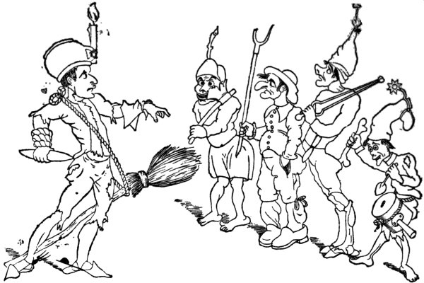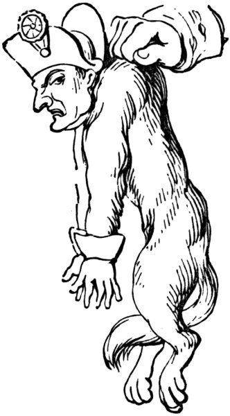 Dean Swift’s immortal book did yeoman’s service to the caricaturists, and we find it again employed in a print by West, December 1803: ‘The Brobdingnag Watchman preventing Gulliver’s landing.’ It is very feeble, and merely consists of George the Third as a watchman turning the light of the ‘Constitutional Lanthorn’ upon Bonaparte and his companions, who are attempting a landing.