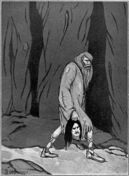 Poor girl, she was not used to such treatment. She became very weak and ill. At last she gave up and approached an old hut in the forest. Here she was taken in by an old woman, who fed her and nursed her.