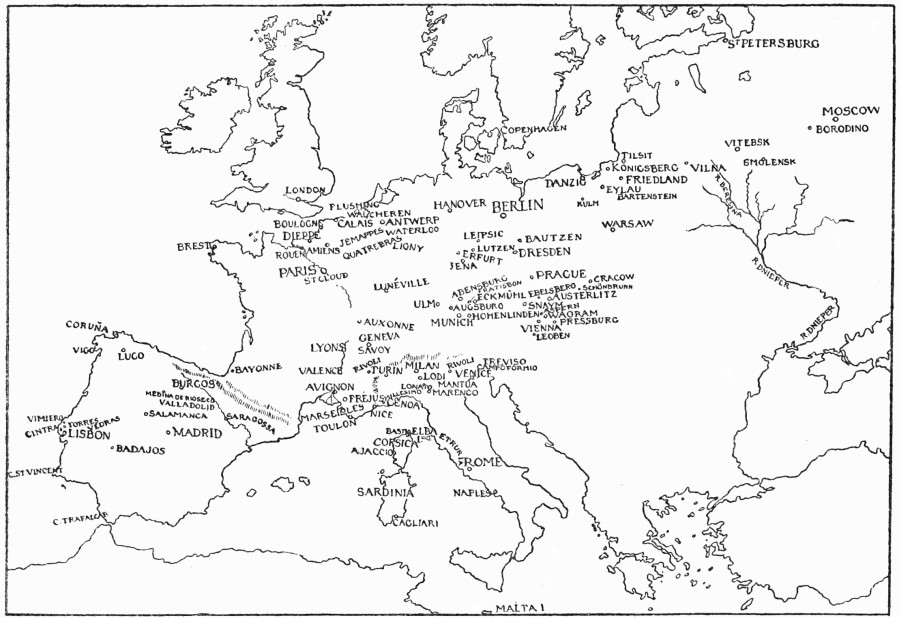 As regards authorities, special reference must be made to Volume IX. of the monumental “Cambridge Modern History,” Dr J. Holland Rose’s just and impartial “Life of Napoleon I.,” Sir John Seeley’s somewhat disparaging “Short History of Napoleon the First,” Mr F. Loraine Petre’s masterly studies of the Polish, Prussian, and Austrian campaigns, Sir Archibald Alison’s “History of Europe,” which has by no means lost its usefulness since more modern research has added to our knowledge of the epoch, Mr Oscar Browning’s interesting “Boyhood and Youth of Napoleon, 1769–1793,” and Mr Hereford B. George’s “Napoleon’s Invasion of Russia.”10 A host of other volumes dealing with the same inexhaustible subject which line the shelves of my crowded library have also been utilised, I trust, to good purpose.