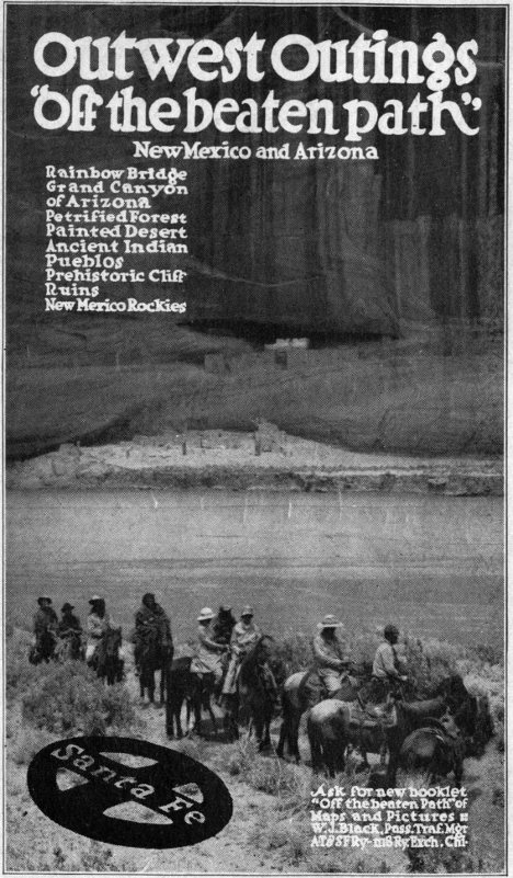 If you are in a hurry you may “do” Santa Fe and its immediate environs in a carriage or an automobile in a couple of days, and departing secretly think it a rather overrated little old place. To get into the atmosphere of it, however, you should drop hurry at its gates and make up your mind to spend at least a week there, and longer if you can. Lounge in the Plaza and watch the ebb and flow of the city life that gathers here; drop into the Indian trading stores and get a taste for aboriginal art. White man’s schooling has brought about of late years a decline in the quality of Indian handicraft, but there is still a lot of interest in these Santa Fe curio shops—Navajo and Chímayo blankets, Pueblo pottery, Navajo silver jewelry, Apache baskets, moccasins, bead-work, quaint tobacco pouches, Spanish and Mexican things—serapes, mantillas, rusty daggers, old silver snuff boxes—and what not. Mount the hill at the city’s northern edge, and sit on the 18 ruined walls of the old garita (where the Mexican customs used to be levied upon imports by the Santa Fe Trail). There you get a magnificent bird’s-eye view of the city in its mountain fastness, and if the day be waning you will have a sunset for your benediction, long to remember. Extend your rambles sometimes to the outskirts for unadvertised sights—the little ranches with their outdoor threshing floors of beaten earth where in August you may see the wheat tramped out by horses, sheep or goats, and winnowed by tossing in the breeze; paisanas washing their linen on stones by the brookside as in Italy or Spain; and the gaunt descansos or crosses of rest, marking stopping places of funerals, and carving in illiterate Spanish scrawled upon the wood, prayers for the repose of departed souls. If you are fortunate enough to have a little Spanish, your enjoyment will be enhanced by stopping at humble doorways for a bit of chat with Juan Bautista the woodchopper, or Maria Rosalía the laundress. You will be civilly welcome, if you yourself are civil, and be handed a chair, if there be one, and 19 will be refreshed to learn something of the essential oneness and kindliness of the human family whether clothed in white skin or brown. It is this pervading air of Old Worldliness that makes the peculiar charm of Santa Fe for the leisurely traveler—its romance and its history are not altogether hidden away in books, but are an obvious part of its living present.