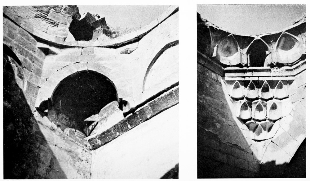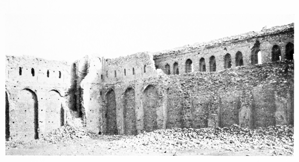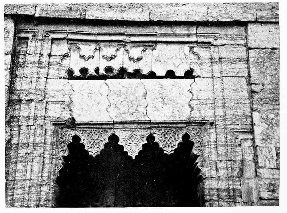 of the original local appellation, which never slipped out of memory and finally conquered the Greek Berœa. Mohammadan tradition recognizes the fact that Ḥaleb was the ancient name of the city in the foolish tale which connects it with the cows of Abraham, the root of the word Ḥaleb being the verb signifying to milk, and the Emperor Julian knew that Berœa was the same as Chaleb. Aleppo is not without evidences of a remote antiquity. Every archæologist in turn has tried his hand at the half obliterated Hittite inscription which is built, upside down, into the walls of the mosque of Ḳiḳân near the Antioch gate; among the ruins of the citadel are two roughly worked Hittite lions (Fig. 2; Mr. Hogarth was the first to identify them), and I found in the French Consulate a headless eagle carved in basalt which belongs to the same period (Fig. 3). The steep escarpment of the castle mound is akin to the ancient fortified sites of northern Mesopotamia. Julian mentions the acropolis of Berœa. It was protected in a later age by a revetment of stone slabs, most of which were stripped away by Tîmûr Leng when he overwhelmed the town in 1401 and laid it in ruins. I know of only one building in Aleppo the origin of which can be attributed with certainty to the pre-Mohammadan period, the Jâmi’ el Ḥelâwîyeh near the Great Mosque (Fig. 6). It has been completely rebuilt; the present dome, resting on pendentives, with a tambour broken by six windows, belongs to one of the later reconstructions, but the beautiful acanthus capitals must be ascribed to the fifth century on account of their likeness to the capitals in the church of St. Simeon Stylites, a day’s journey north-west of Aleppo. The great school of architecture which they represent affected the builders of Islâm through many a subsequent age, and you will find the Mamlûks still flinging the leaves of the wind-blown acanthus about the capitals in their mosques. In the tenth century Aleppo was the chief city of the Ḥamdânid prince Seif ed Dauleh, a notable patron of the arts. It was he who built the south gate in the walls, the Bâb Kinnesrîn, and rebuilt the Antioch Gate after its destruction by Nicephorus Phocas; he repaired the citadel,{12} set the shrine of Ḥussein upon the hill-side west of the town, and erected his own splendid dwelling outside the walls to the north. His palace was ravaged before his death, his gates and mosques have been rebuilt, and there remains for the period before Saladin little or nothing but the mosque inside the citadel, built in 1160 by Nûr ed Dîn, the greatest of the Syrian atabegs, and the Jâmi’ esh Shaibîyeh near the Antioch Gate, which, in spite of its ruined condition, is one of the loveliest monuments of the art of Islâm in the whole town of Aleppo (Fig. 4).[1] Along the top of the wall and carried uninterruptedly round the square minaret, runs a Cufic inscription, cut in a cavetto moulding. Below it is a band of interlacing rinceaux, unsurpassed in boldness and freedom of design, and above it a heavy cymatium, borne on modillions and adorned with rinceaux. The classical outline of the cornice, together with the exquisite Oriental decoration, give it a singular hybrid beauty. This mosque apart, the finest buildings are due to the Ayyûbids, and chiefly to El Malik eẓ Ẓâhir, the son of Saladin, who ruled in Aleppo at the end of the twelfth century. Beyond the walls to the south of the city, in the quarter of Firdaus, the descendants of Saladin held their court, and though their palaces have disappeared—how much more we should know of Mohammadan architecture if each successive conqueror had not ruined the house of his predecessor!—the suburb is still resplendent with mosques and tombs. Here stands the Medresseh of El Malik eẓ Ẓâhir, with an arcade borne on capitals that retain a reminiscence of classical form though they are hung with a garland of leaves that are closer to the Sasanian than to the Greek (Fig. 5).[2] Near it is the mosque of Firdaus built by the king’s widow when she was regent for her son. Over the miḥrâb of this mosque is a bold entrelac decoration which is to be found also in the shrine of Ḥussein, a building that{13}