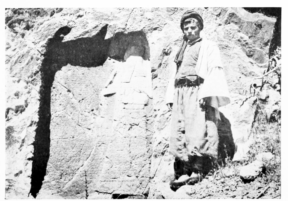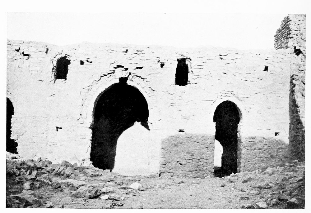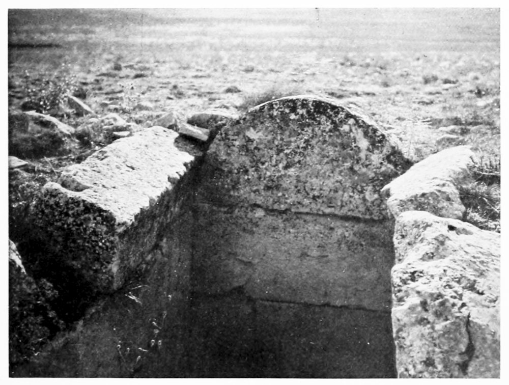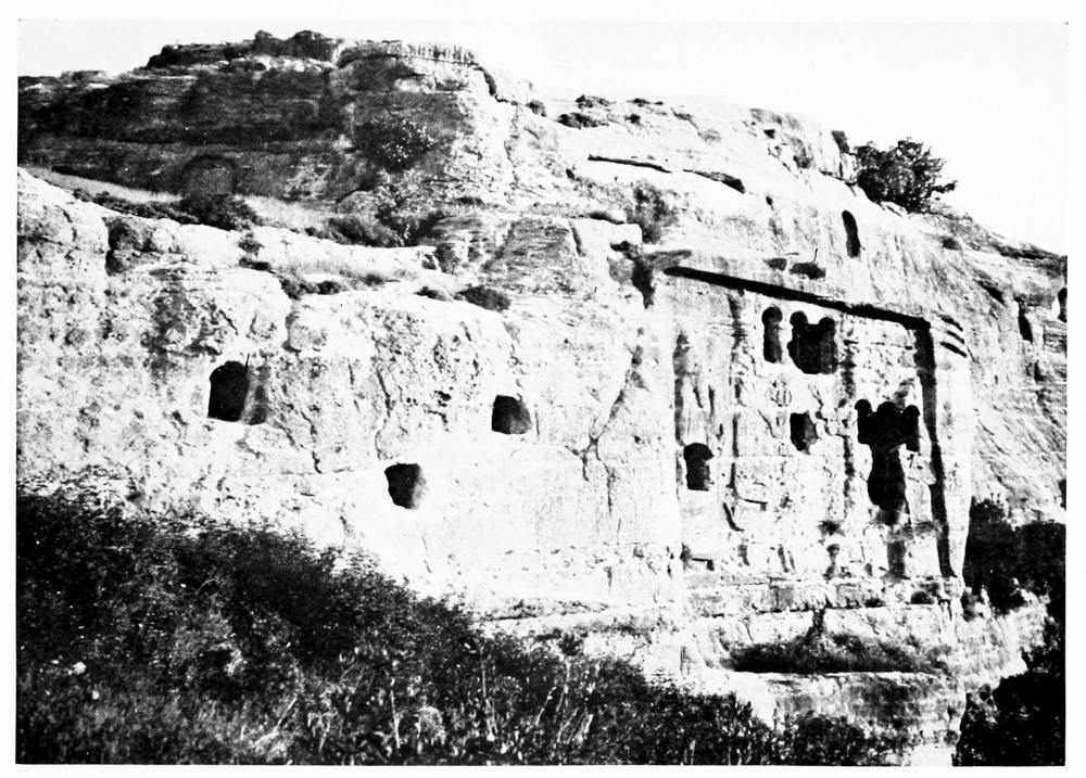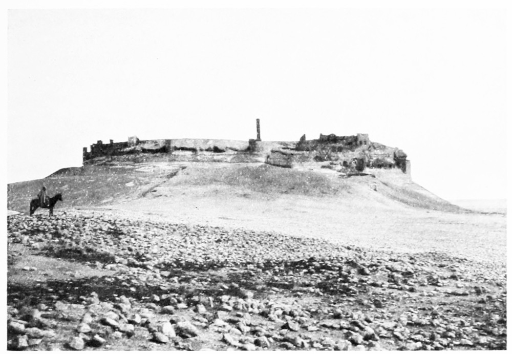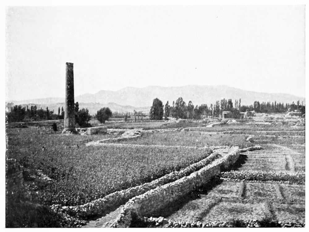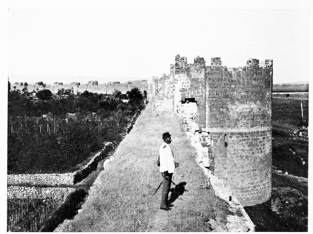 At Aleppo the current of the imagination is tributary to the Euphrates. With Xenophon, with Julian, with all the armies captained by a dream of empire that dashed and broke against the Ancient East, the thoughts go marching down to the river which was the most famous of all frontier lines. So we turned east, and on a warm and misty February morning we passed under the cypresses of Abu Bekr and took the road to Hierapolis. It was a world of mud through which we journeyed, for the rains had been heavy, and occasionally a shower fell across our path; but rain and mud can neither damp nor clog the spirit of those who are once more upon the road, with faces turned towards the east. The corn was beginning to sprout and there were signs too of another crop, that of the locusts which had swarmed across the Euphrates the year before, and after ravaging the fields had laid their eggs in the shallow earth that lies upon the rocky crest of the ridges between cornland and cornland. Whenever the road climbed up to these low eminences we found a family of peasants engaged, in a desultory fashion, in digging out the eggs from among the stones. Where they lay the ground was pitted like a face scourged with smallpox, but for every square yard cleared a square mile was left undisturbed, and{17} the peasants worked for the immediate small reward which the government paid for each load of eggs, and not with any hope of averting the plague that ultimately overwhelmed their crops. It comes and goes, for what reason no man can tell, lasting in a given district over a term of lean years, and disappearing as unaccountably as it came: perhaps a storm of rain kills the larvæ as they are hatching out, perhaps the breeding season is unfavourable—God knows, said Ḥâjj ’Alî, the zaptieh who accompanied me. The country is set thick with villages, of which Kiepert marks not the tenth part—and even those not always rightly placed. We passed his Sheikh Najar, and at Sheikh Ziyâd I went up to see the ziyârah, the little shrine upon the hill-top, but found there nothing but a small chamber containing the usual clay tomb. We left Serbes on the right—it was hidden behind a ridge—and took a track that passed through the village of Shammar. Not infrequently there were old rock-cut cisterns among the fields and round the mounds whereon villages had once stood. At Tell el Ḥâl, five hours from Aleppo, a modern village lies below the mound, and by the roadside I saw part of the shaft of a column, with a moulded base, while several more fragments of columns were set up as tombstones in the graveyard. An hour before we reached Bâb we caught sight of the high minaret of the ziyârah above it. It is a flourishing little place with a bazaar and several khâns, in one of which I lodged. The heavy rain-clouds that had hung about us all day were closing down as evening approached, but I had time to climb the steep hill to the west of the village, where a cluster of houses surrounds the ziyârah of Nebî Ḥâshil—so I heard the name, but Abu’l Fidâ calls it the Mashhad of ’Aḳil ibn Abî Ṭâlib, brother of the Khalif ’Alî[4]—an old shrine of which the lower part of the walls is built of rusticated stones. The tomb itself was closed, but I went to the top of the minaret and had a fine view of the shallow fruitful valley of the Deheb, which, taking its source near Bâb and the more northerly Tell Batnân, runs down to the salt marshes at the foot of Jebel{18} el Ḥaṣṣ. Across the valley there is a notable big mound with a village at its foot, the Buzâ’â of the Arab geographers, “smaller than a town and larger than a village,” said Ibn Jubeir in the twelfth century. The ancient Bathnæ where Julian rested under “a pleasant grove of cypress trees” is represented by Buzâ’â and its “gate” Bâb. He compares its gardens with those of Daphne, the famous sanctuary of Apollo near Antioch, and though the gardens and cypresses have been replaced by cornfields, it is still regarded by the inhabitants of Aleppo as an agreeable and healthy resort during the hot months of summer. Perhaps we may carry back its history yet earlier and look here for the palace of Belesys, the Persian governor of Syria, at the source of the river Dardes, which Xenophon describes as having “a large and beautiful garden containing all that the seasons produce.”[5] Cyrus laid it waste and burned the palace, after which he marched three days to Thapsacus on the Euphrates; but the Arab geographers place Bâlis (which some have conjectured to have occupied the site of the Persian palace) two days from Aleppo, and the position of Thapsacus has not been determined with any certainty. If it stood at Dibseh, as Moritz surmises,[6] Cyrus could well have reached it in three marches from Bâb, and I am inclined to think that Xenophon’s account identifies the satrap’s pleasaunce with the garden of Bathnæ. In Kiepert’s map the relative distances between Aleppo and Bâb and Bâb and Manbij are not correct. I rode the two stages in almost exactly the same time (seven and a quarter hours), and the caravan took nine hours each day, whereas the map would have the march to Manbij a good two hours longer than the march to Bâb.[7]