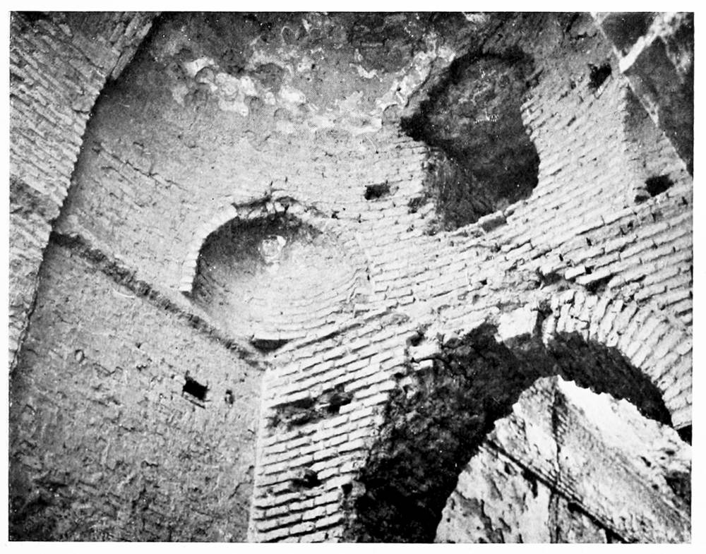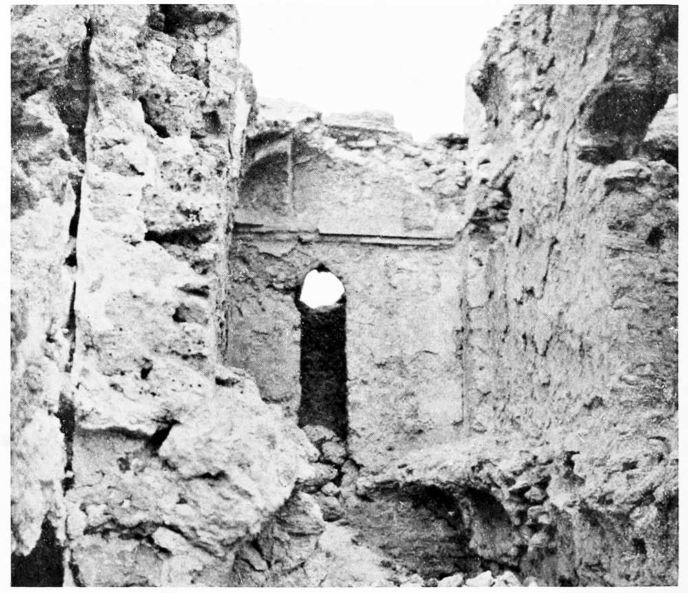 We passed on our return the tekîyeh of Abu Bekr, a beautiful Mamlûk shrine with cypresses in its courtyard, which lift their black spires proudly over that treeless land. The brother of the hereditary sheikh showed me the mosque; it contains an exquisite miḥrâb of laced stone work, and windows that are protected by carved wooden shutters and filled with old coloured glass. Near the mosque is the square hall of a bath, now fallen into disrepair. Four pendentives convert the square into an octagon, and eight more hold the circle of the dome—as fine a piece of massive construction as you would wish to see. The sheikh and his family occupied some small adjoining rooms, and the young wife of my guide made me welcome with smiles and lemon sherbet. From the deep embrasure of her window I looked out upon Aleppo citadel and congratulated her upon her secluded house set in the thickness of ancient walls.