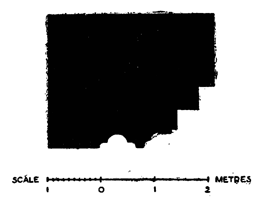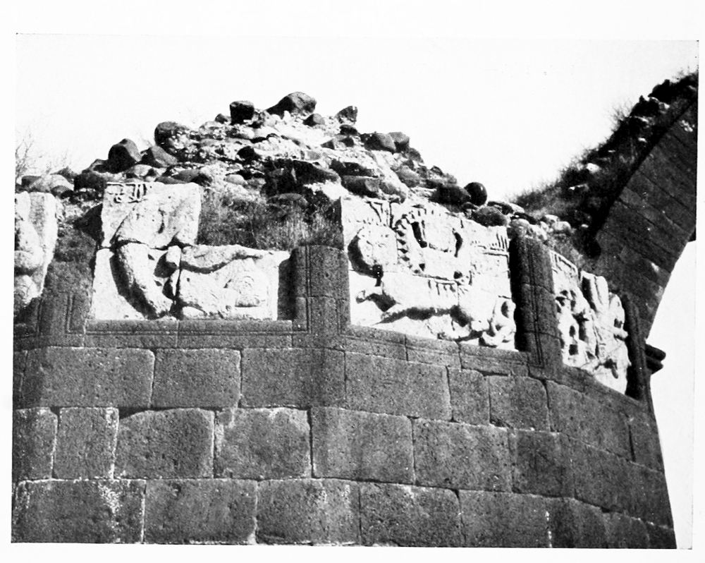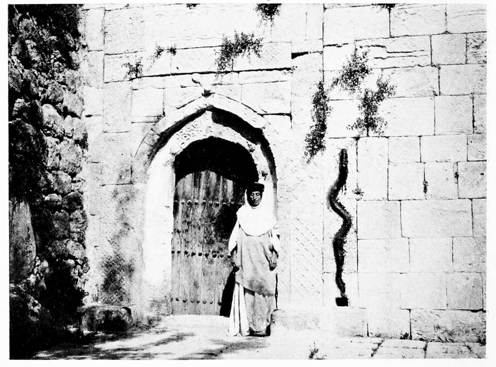 Like the numismatic emblem of a city goddess, Aleppo wears a towered crown. The citadel lies immediately to the east of the bazaars. A masonry bridge resting on tall narrow arches spans the moat between a crenelated outpost and the great square block of the inner gatehouse. Through a worked iron door, dated in the reign of El Malik eẓ Ẓâhir, you pass into a vaulted corridor which turns at right angles under an arch decorated with interlaced dragons (Fig. 13), and ends at another arched doorway on which stand the leopards of Sultan Baybars, who rebuilt the castle in the thirteenth century. Above the entrance is a columned hall, grass-grown and ruined; passages lead down from it into vaulted chambers which would seem to have been repaired after Tîmûr had sacked Aleppo. Some of the blocks used in the walls here are Jewish tombstones dated by Hebrew inscriptions in the thirteenth century, and since it is scarcely possible that Baybars should have desecrated a cemetery of his own day, they must indicate a later period of reconstruction. The garrison was supplied with water from a well eighty metres deep which lies near the northern edge of the castle mound. Besides the well-hole, a stair goes down to the water level, near which point vaulted passages branch out to right and left. Tradition says that the whole mound is raised upon a substructure of masonry, but tradition is always ready with such tales, and the only inscription in the passages near the well is Cufic. At the northern limit of the enclosure stands a high square tower, up which, if you would know Aleppo, you must climb. From the muedhdhin’s gallery the town lies revealed, a wide expanse of flat roof covering the bazaars, broken by dome and minaret, by the narrow clefts of streets and the courts of mosque and khân. The cypresses of Abu Bekr stand sentinel to the north; from that direction Tîmûr entered through the Bâb el Ḥadîd. In the low ground beyond the Antioch Gate, the armies of the Crusaders lay encamped; the railway, an invader more powerful than Baldwin, holds it now. Turn to the east, and as far as the eye can see, stretch rolling uplands, the granary of North Syria, and across them wind the caravan tracks that lead into inner Asia. There through the waste{16} flows the Euphrates—you might almost from the tower catch the glint of its waters, so near to the western sea does its channel approach here.