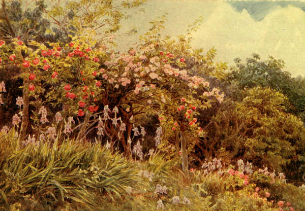 But Veronica had no monopoly of success in the swift adornment of our new wing. I, too,159 had a little triumph of my own, but, I need scarcely say, out-of-doors. I do not often sing my own praises, do I, preferring to extol the Poet and Veronica, who are more deserving of eulogy. But, on this occasion, I think I really did deserve the congratulations that were lavished on me. For, with a truly foreseeing mind, I had been growing on, to use a gardener’s phrase, a certain number of climbing roses, clematis, jessamine, and other creepers, and had given the strictest injunctions that they were to be planted against the new building the very instant the masons had finished it, and were to be fostered and trained with constant and unremitting attention; and, as they were then already robust in growth and vigorous at the root, they were well on their way up the new wing on our arrival. A legend has since grown up that I did not leave England at all, but remained on the spot with barrow, trug, and trowel, and that, fast as the work-people laid a course of stone or brick, I planted a creeper. But, as a fact, it happened as I have said.