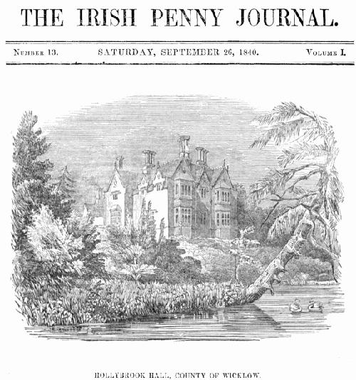 Among the very many beautiful residences of our nobility and gentry, situated within a drive of an hour or two of our metropolis, there is probably not one better worthy of a visit than that which we have chosen to depict as the illustration of our present number—Hollybrook Hall, the seat of Sir George Frederick John Hodson, Bart. It is situated in the county of Wicklow, about a mile beyond the town of Bray, and about eleven miles from Dublin.
