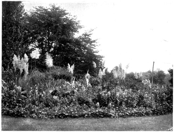 A very good arrangement is to put a large bed of Ricinus on the most remote space of the lawn—four plants in the centre of a twelve-foot bed—surrounded with a row of Salvia splendens edged with Little Gem Sweet Alyssum. Nearer, an eight-foot bed of the large-flowered Cannas may be introduced and edged with Coleus or the second size of Caladiums, while a six-foot bed of ornamental grasses—Arundo Donax, Erianthus Ravennæ, Eulalia gracillima univittata—will make a satisfactory third. Such beds are rich in tropical effects and give more distinction to a lawn than any other class of plants.