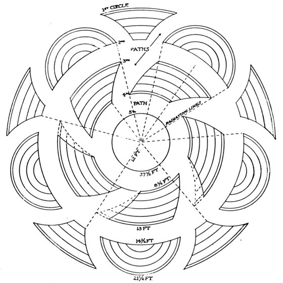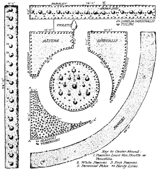 The scheme for a permanent garden must be decided by the size and shape of the plot of ground at command, an irregular plot sometimes lending itself to more graceful arrangement than a symmetrical one. The operation of laying out the beds will be the same, whatever the shape. Having decided the boundaries of the garden it will be best to mark the outlines by a cord attached to pegs driven into the ground. The sod should then be removed from the entire area by cutting just below the crown of the grass. Desirable arrangements of beds are shown in accompanying illustrations. Two and one-half or three feet should first be allowed for walks. The beds may be placed to advantage by finding the centre of the plot and driving there a stake to which a cord is loosely attached. Mark off on this cord half the diameter of the bed desired, for centre of plot, four, five or six feet—fasten to the cord at this point a sharp stick and describe the circle on the ground. In this way the garden walks may be outlined and the inner and outer circles of the round beds. The oval beds must be 7measured off and defined by stakes driven into the ground. The width of the beds should be not more than can be easily reached across for weeding and cultivating. Where the soil has not been previously cultivated it must be spaded at least two feet deep, and thoroughly pulverised. All roots and stones should be removed. If the soil is clayey or gravelly it will be best to remove it entirely and to fill in with soil better adapted to the growth of flowers. Or the surface may be removed for several inches and laid aside. Then the poorer subsoil should be dug out and removed and the surface-soil replaced in the bottom of the bed with a liberal quantity of old, well-rotted manure. The bed should then be filled to its original level with leaf-mould or muck. If all the original soil is to be retained, remove the top-soil for top-dressing. Spade the manure into the subsoil and replace the surface-soil. In ground which has not been cultivated this surface-soil is rich in humus or leaf-mould, which furnishes food in its most available form for the young plant, and should, therefore, be left where the plant can use it and not be turned under as is usually done. Nature never turns the soil upside down; nor will the wise gardener, except when a richer and better soil is to be added or when it is necessary to work in manure.