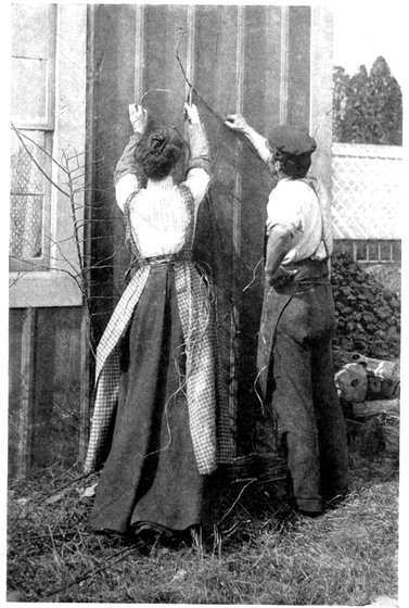 Don’t try to work in unsuitable clothing. Easy, broad, solid shoes—not any old run-down pair—should be considered as essential as a spade, or rake, and skirts that clear the instep, and hang comfortably. Waists with easy arm-holes and collar will enable one to work with a degree of comfort that means the accomplishment of an amount of work in a morning quite impossible were one less comfortably clad. Skirts of blue denim, made Princess style, and ankle length, with comfortable shirt-waists—denim for cool days, calico for warm—make a thoroughly comfortable outfit.