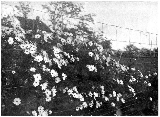 Fences may be made attractive with vines or plants. Sweet-peas, Nasturtiums, Morning-glories, Cobæa scandens, Wild Cucumbers, the Scarlet-fruited Gourd, Roses, Clematis or Honeysuckles make a good background for the lawn and beds of bright flowers.