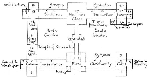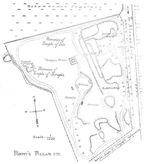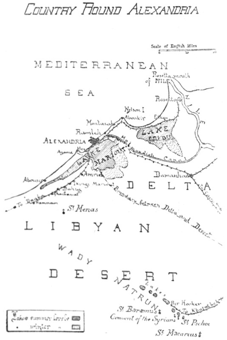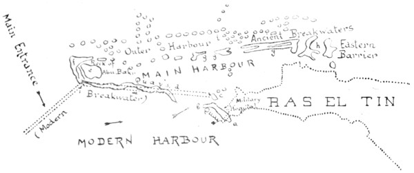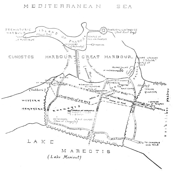 The “History” is written in short sections, and at the end of each section are references to the second part—the “Guide”. On these references the chief utility of the book depends, so the reader is begged to take special note of them: they may help him to link the present and the past. Suppose, for instance, he has read in the History iiabout the Pharos: at the end of the section he will find references to Fort Kait Bey where the Pharos stood, to Abousir where there is a miniature replica of it, and to the Coin Room in the Museum, where it appears on the moneys of Domitian and Hadrian. Or again, suppose that the tragic fate of Hypatia has touched him: at the end will be references to the Caesareum, where Hypatia was murdered, and to the Wady Natrun, where the monks who murdered her generally resided. Or the British victories of 1801: he will be referred to the country over which our troops marched, to the Abercrombie Monument at Sidi Gaber, and to a tombstone in the courtyard of the Greek Patriarchate. The “sights” of Alexandria are in themselves not interesting, but they fascinate when we approach them through the past, and this is what I have tried to do by the double arrangement of History and Guide.