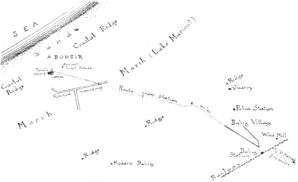 The Wady Natrun (i.e. Natron, Soda) is a curious valley that begins near Cairo, and slopes north-westward into the heart of the Lybian Desert. It may have once been an outlet of the Nile, though it is barred now from the sea by coastal hills. Its upper and lower reaches are both barren, but in the central section—that which the railway taps—water survives in the form of a chain of mineral lakes.