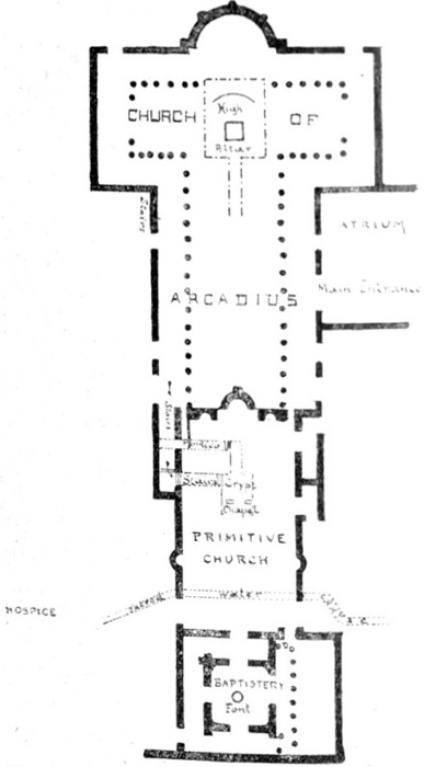 (i). Church of Arcadius.—Length nearly 200 feet. A cruciform basilica with a nave and two aisles, and aisled transepts. Over the intersection was a dome, beneath which, now much ruined by its fall, is the High Altar. Behind the altar are curved steps that supported the ecclesiastical throne. Both altar and throne are in a square enclosure where the priests and singers stood; a narrow alley connects it with the nave. The eastern apse has been used for burials.