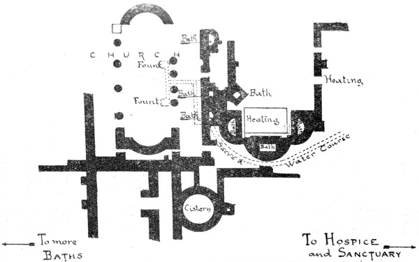The Sacred Baths (Plan II). About 80 yards from the Monastery Buildings. Best located by the fine circular cistern of well-cut limestone blocks. The main building has a heating apparatus and three baths. Also a small but finely finished church; basilica type; apses at each end; three aisles. Two baths open straight out of its 200south aisles, and in its nave are two marble fountains that were probably filled from the source in the central sanctuary (see above). Throughout the arrangements are significant. The line between the hygienic and the miraculous is nowhere clearly drawn; heating apparatus and church have each to play their parts. Date of the group, probably 5th century. Another group lies beyond.