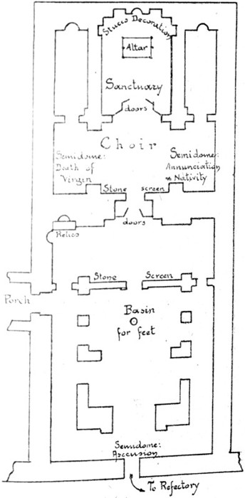 The Sanctuary has, behind the altar, a fine tribune of six steps—three straight and three curved. In the centre was the throne of the Abbot. It has gone, and the marble decorations of the steps are ruined. Above the throne is a marble mosaic. In the centre of the eastern dome is a Cross.