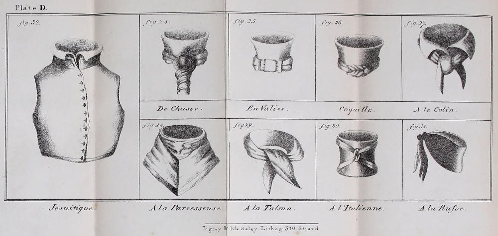 Although the Egyptians, Persians, Greeks, and nearly all the ancient nations, were unacquainted with the use of Cravats and Stocks, they wore collars, which may reasonably be considered as the avant-couriers of both.