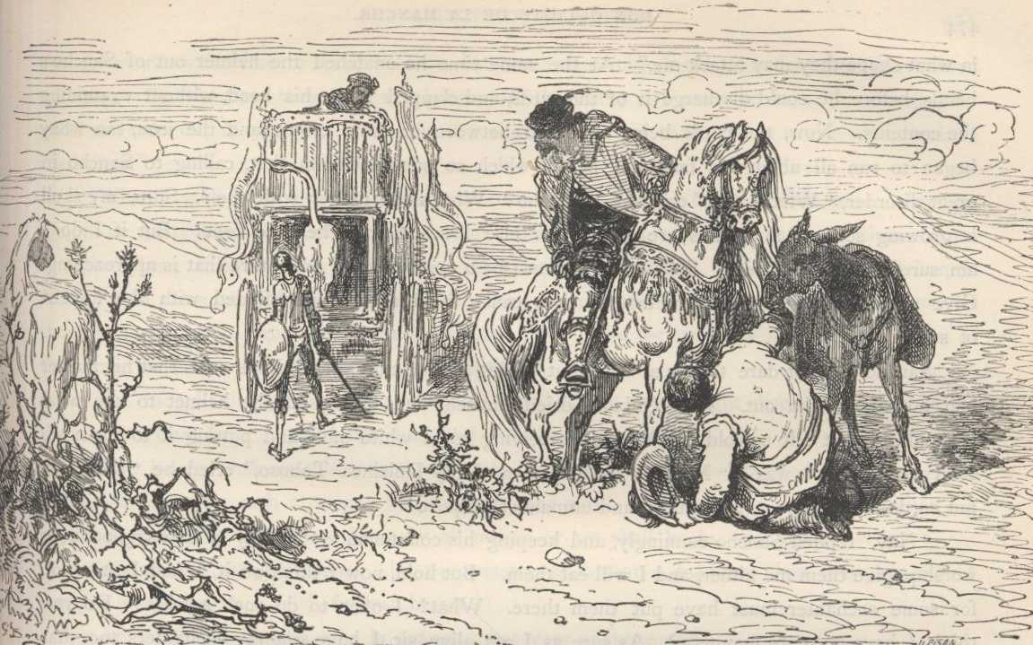The history tells that when Don Quixote called out to Sancho to bring him his helmet, Sancho was buying some curds the shepherds agreed to sell him, and flurried by the great haste his master was in did not know what to do with them or what to carry them in; so, not to lose them, for he had already paid for them, he thought it best to throw them into his master's helmet, and acting on this bright idea he went to see what his master wanted with him. He, as he approached, exclaimed to him: