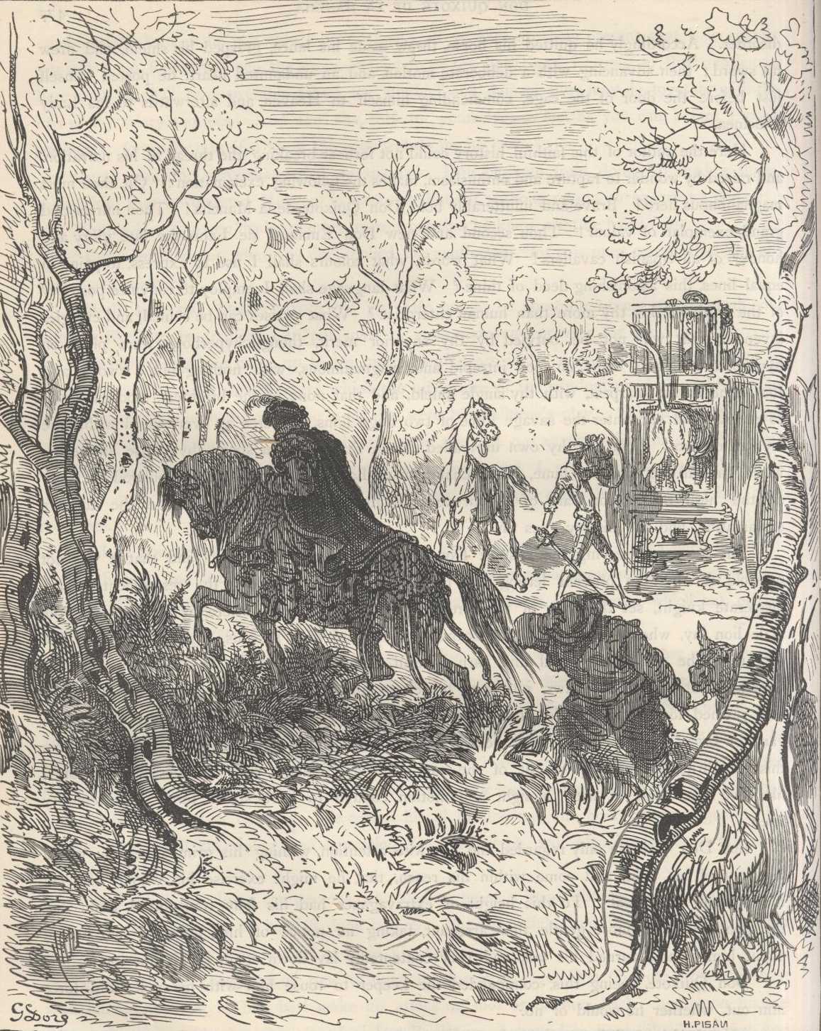 During the delay that occurred while the keeper was opening the first cage, Don Quixote was considering whether it would not be well to do battle on foot, instead of on horseback, and finally resolved to fight on foot, fearing that Rocinante might take fright at the sight of the lions; he therefore sprang off his horse, flung his lance aside, braced his buckler on his arm, and drawing his sword, advanced slowly with marvellous intrepidity and resolute courage, to plant himself in front of the cart, commending himself with all his heart to God and to his lady Dulcinea.