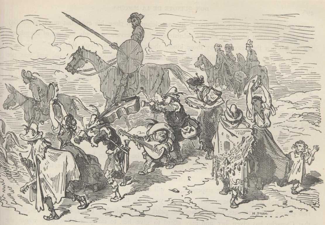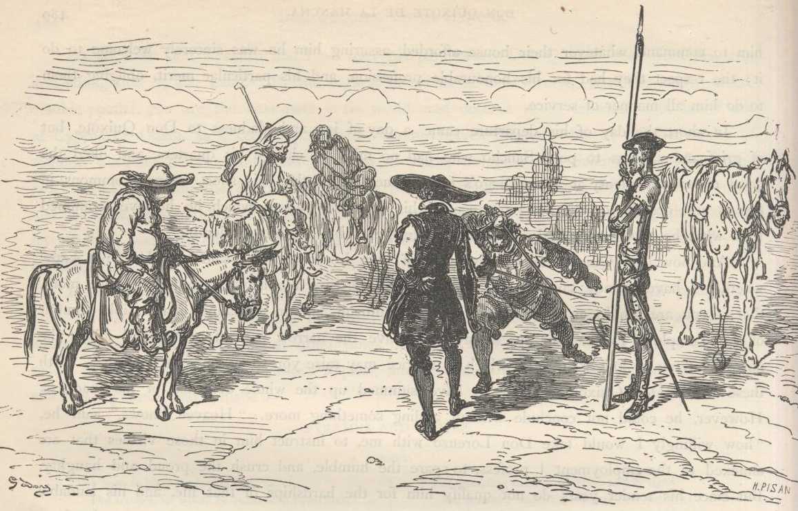 Don Quixote had gone but a short distance beyond Don Diego's village, when he fell in with a couple of either priests or students, and a couple of peasants, mounted on four beasts of the ass kind. One of the students carried, wrapped up in a piece of green buckram by way of a portmanteau, what seemed to be a little linen and a couple of pairs of-ribbed stockings; the other carried nothing but a pair of new fencing-foils with buttons. The peasants carried divers articles that showed they were on their way from some large town where they had bought them, and were taking them home to their village; and both students and peasants were struck with the same amazement that everybody felt who saw Don Quixote for the first time, and were dying to know who this man, so different from ordinary men, could be. Don Quixote saluted them, and after ascertaining that their road was the same as his, made them an offer of his company, and begged them to slacken their pace, as their young asses travelled faster than his horse; and then, to gratify them, he told them in a few words who he was and the calling and profession he followed, which was that of a knight-errant seeking adventures in all parts of the world. He informed them that his own name was Don Quixote of La Mancha, and that he was called, by way of surname, the Knight of the Lions.