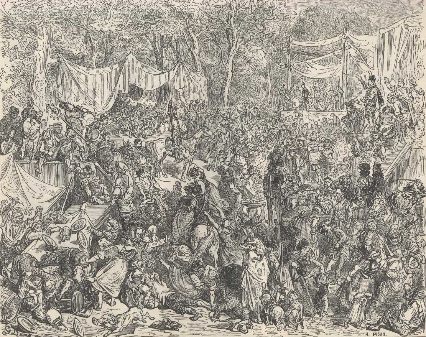 Sancho did as his master bade him, and putting the saddle on Rocinante and the pack-saddle on Dapple, they both mounted and at a leisurely pace entered the arcade. The first thing that presented itself to Sancho's eyes was a whole ox spitted on a whole elm tree, and in the fire at which it was to be roasted there was burning a middling-sized mountain of faggots, and six stewpots that stood round the blaze had not been made in the ordinary mould of common pots, for they were six half wine-jars, each fit to hold the contents of a slaughter-house; they swallowed up whole sheep and hid them away in their insides without showing any more sign of them than if they were pigeons. Countless were the hares ready skinned and the plucked fowls that hung on the trees for burial in the pots, numberless the wildfowl and game of various sorts suspended from the branches that the air might keep them cool. Sancho counted more than sixty wine skins of over six gallons each, and all filled, as it proved afterwards, with generous wines. There were, besides, piles of the whitest bread, like the heaps of corn one sees on the threshing-floors. There was a wall made of cheeses arranged like open brick-work, and two cauldrons full of oil, bigger than those of a dyer's shop, served for cooking fritters, which when fried were taken out with two mighty shovels, and plunged into another cauldron of prepared honey that stood close by. Of cooks and cook-maids there were over fifty, all clean, brisk, and blithe. In the capacious belly of the ox were a dozen soft little sucking-pigs, which, sewn up there, served to give it tenderness and flavour. The spices of different kinds did not seem to have been bought by the pound but by the quarter, and all lay open to view in a great chest. In short, all the preparations made for the wedding were in rustic style, but abundant enough to feed an army.