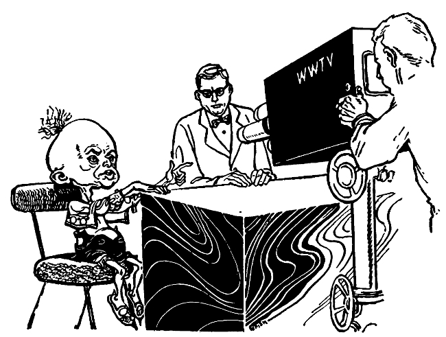 "Uh? Oh, yes. Just joking, of course. Now we're about ready for our telecast with Cecil Burroughs, the greatest commentator in the business. You'll appear with one of our leading scientists."