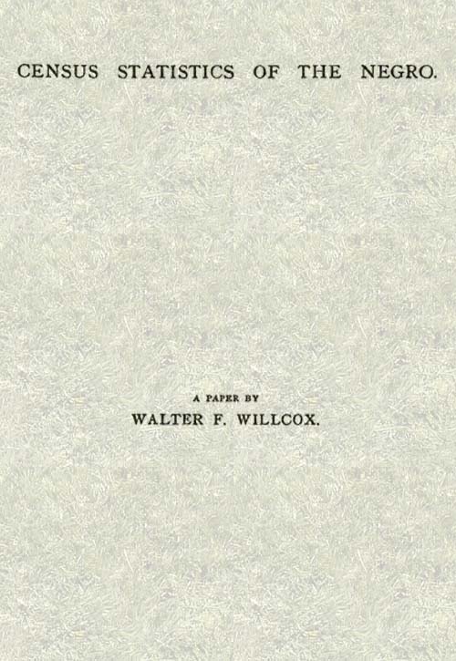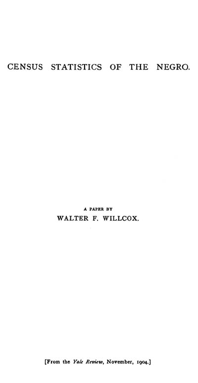 Since the Civil War the statistical study of certain aspects of race questions in the United States has been entered upon by different governmental agencies. The Department of Agriculture has made investigations of the diet and food supply of negroes and of whites with especial reference to the bodily heat and the energy it can produce. The Department of Labor has made a number of suggestive reports upon the condition of negro communities in certain typical localities. Various municipal health reports throw light upon the vital statistics of the two races. The Bureau of Education has gathered much information regarding the educational development of negroes and whites. But no one of these and perhaps not all of them combined have furnished or are furnishing at the present time as much information regarding the statistics of race in the United States as the Census Bureau.[1] It is of the highest importance that the information thus gathered should be carefully and intelligently interpreted and its lessons correctly read. The object of this paper is to state certain conclusions to which I have been brought by my statistical studies of the subject and especially of the recent census figures.