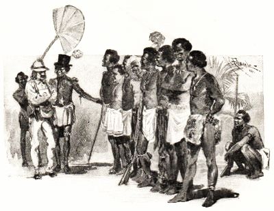 Then the King said: "These men will follow you wherever you go, Moguizi. They know every tree, every path of the forest. They know where the game is to be found." Then, addressing them, he said: "Go make your guns ready; see that their flints are right so that they do not miss fire, and cook food enough for three or four days. Be here in two days." They followed me to my house, and I gave to each what I promised. At night I called the King, gave him a brand-new flint-gun, two brass kettles, ten brass rods, and several bunches of beads. He was delighted, and took hold of my foot as a token of submission, which meant that he would obey me.