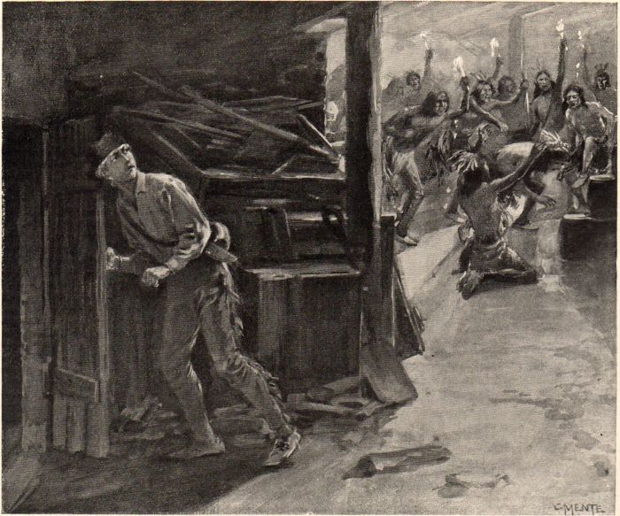 Suddenly came other sounds than the distant drone of trumpet and tuba. Surely that was gun-firing. There could be no mistake, indeed, for punctuating the muffled roar was heard the long-drawn "wow-wow-wow" of the whooping savages. The hour had come. A mile and a half from the fort, where now stands a memorial tablet under an old cottonwood-tree in the thick of the princeliest residences of a great city, the cloud had burst. From behind the sand ridge which divided the prairie from the beach five hundred warriors had sprung suddenly to their feet, like arrows drawn to the head, and poured in a hail-storm of bullets, to which the treacherous escort added their quota. Harold had stood for some time spellbound by his own thoughts and fears, but the trance was now broken. He ran hot-foot toward the scene of the struggle. Each step brought the sights and sounds of the massacre clearer. Shrieks, yells, the rumble of the firing, dark forms leaping like madmen with uplifted arms, or bending like wild-beasts over objects on the sand. It was a tumult of horror beyond words. After a little the confusion lessened, and there was a pause, followed by the howl of triumph which is the Indian's pæan of victory. Harold, primped out by his wild run, had hidden behind a sand hill for breath, within a stone's-throw of the scene, for the savages, absorbed in their work of death, had not noticed his advancing figure. One wagon, from which now came the wail of a sick child, had escaped their fierce handiwork, and three warriors with bare tomahawks bounded toward it. The boy, taking steady aim, discharged both barrels of his rifle, and one of the red men fell. Every nerve tense with excitement, Harold sprang forward with his clubbed gun, and, catching a tomahawk cut on the barrel, dashed the butt into the head of the nearest savage. As the latter fell with closing eyes, it was with a thrill of satisfaction, strangely blended with awe, as if some higher power had struck by his hand, that the boy recognized the face of the leader of the savages who had slain his uncle and his family. The next moment he was half throttled by a clutch about his throat.