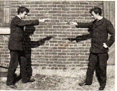 I suppose that many people who travelled by the coach that passed the cross-roads every day wondered who the boy was that used to stand with a tall gun beside him at a fence corner, silently watching the lumbering vehicle go down the highway in a cloud of dust. I must have presented a quaint sight, no doubt, for my clothes were of home manufacture and I kept growing out of them. But the buttons, I recollect, on the rough cloth, were very beautiful, and inscribed with the same crest that was painted on one corner of the portrait with the flowing brown hair; these buttons played an important part in subsequent adventures, and I would give a finger to possess one at the present writing. But I am forging ahead of my story. To get back to it in quick order: