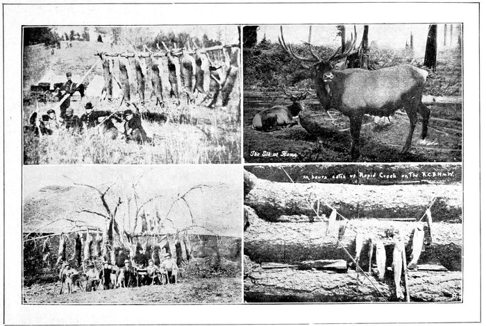 In the wilder portions, bears, wild cats, wolves, silver foxes, and other large game may be found. Special provision has been made for re-stocking the Forest Reserve at frequent intervals with deer and elk which, together with legal protection for these animals from December 1st to November 1st makes them very plentiful. Plover, partridges, pheasants, grouse, ducks and geese may be easily had in season. Although many kinds of fish are found in the mountain streams, trout are the most common. The streams are restocked at frequent intervals from the Government Fishery at Spearfish with Brook, Locklaven, Speckled and Rainbow trout, so that fishing will continue to be one of the leading diversions of the pleasure seeker. From November 1st to May 1st when trout fishing is prohibited in South Dakota, the sport may be continued across the line in Wyoming where no such restriction exists.