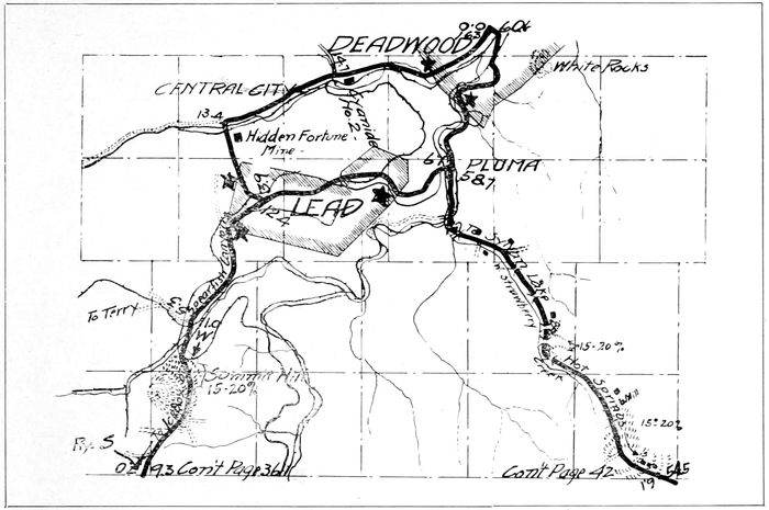 The possibility of motoring through various sections of the Black Hills for pleasure and business has long been known. The idea is new, however, of selecting good automobile routes to reach the larger cities and points of scenic interest in this region, and of platting the same as a guide to the stranger who may be easily lost amid the windings and branchings of the roads in forest, mining camp or city. The strenuous efforts of various localities and counties along these routes to improve them during the last two years has made them now such as may be travelled with pleasure.