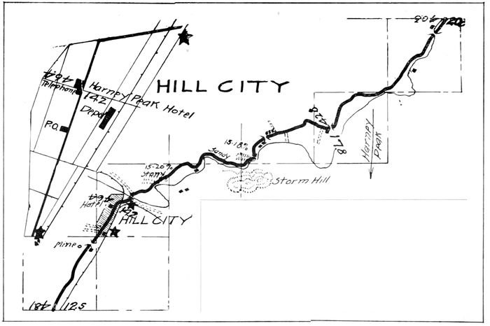Hill City is situated on the Burlington Railroad, and is right in the midst of the mining district of the Southern Black Hills, it is surrounded by fine mountain ranches, that have suffered only one crop failure in 25 years. These ranches produce 60 to 70 bushels of oats per acre that weigh from 40 to 48 lbs. to the bushel, wild and timothy hay grow abundantly, as well as potatoes, all without irrigation.