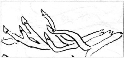 Draw a line through the maze from where Caleb is now (lower left corner of the maze: he’s got the bundle of sticks on his shoulder) to the safety of the redoubt (pronounced “re-dowt”), the zig-zag wooden wall.