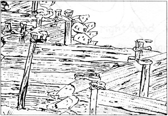 Obstacles would be placed outside the fortifications. Sometimes they would be made by boring (drilling) holes through logs and putting pointed poles through the holes. These were called chevaux de fris (pronounced “shuh-vo-duh-free”). A quicker obstacle could be made by cutting down trees and sharpening a tangle of branches. This was called abatis (pronounced “ah-bah-tee”); it was used a great deal at our battlefield. When placed properly, these obstacles could force an enemy to attack in directions where they could not sneak up on the defender—and where the defenders were waiting for them.