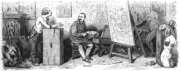 Voulez-vous un Spartacus, un César, un Cicéron, un saint Étienne, un Clovis, un Molière, etc.? Souhaitez-vous faire revivre sur la toile une notabilité quelconque de l’antiquité ou des temps modernes? Vous faut-il un baron féodal ou un serf, un Européen ou un sauvage, un martyr ou un Jupiter Olympien, un discobole ou un soldat de la république française? Allez vous-en dans une de ces rues sales et tortueuses dont fourmille notre belle capitale; montez un escalier qui tient le milieu entre une échelle et un mât de cocagne, et là, au fond de quelque grenier, vous trouverez la notabilité demandée, le saint, l’empereur, le roi, le poëte, le guerrier, ad libitum, dans la personne du modèle.