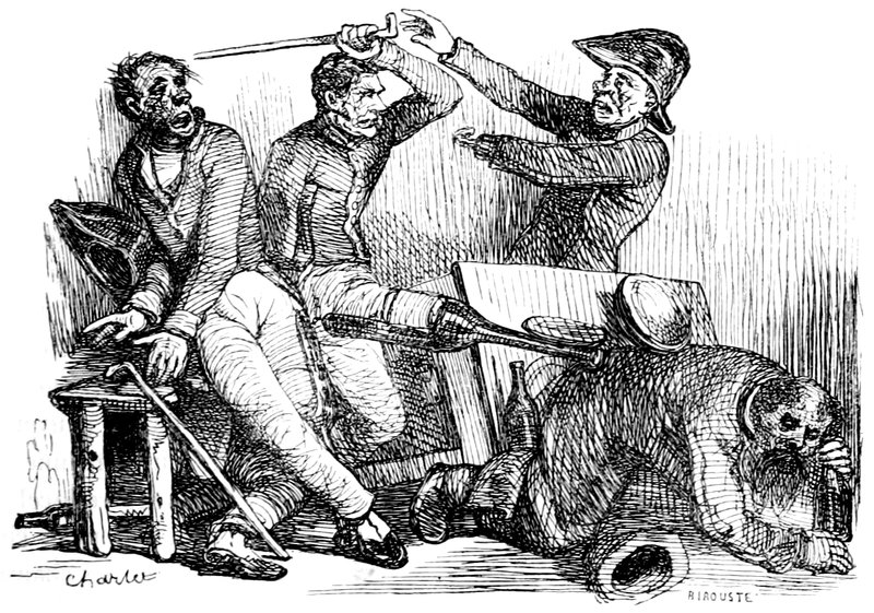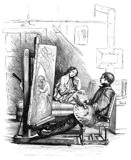 L’artiste était en tenue de travail; il avait sa blouse multicolore, son bonnet rouge, sa palette à la main et sa pipe à la bouche. Le modèle, après avoir déjeuné le plus copieusement possible, se déshabillait lentement, et commençait ses exercices.
