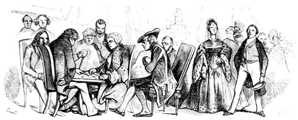 Les cheveux d’un jeune homme du temps, relevés à racines droites sur son front, couronnaient sa tête par un toupet crêpé, pommadé, poudré à frimas, et accompagné de deux rangs de boucles circulaires qui rejoignaient la queue enfermée dans un ruban de soie noire. Cette mode exigeait des papillotes deux fois par semaine avec frisure complète, opération fort longue, pendant laquelle jeunes et vieux, grands et petits, prenaient un singulier plaisir à écouter les nouvelles dont les artistes en perruques étaient toujours abondamment pourvus. Suivant la tradition, le pompeux Buffon cessait chaque matin de donner audience à son esprit, afin de prêter une oreille complaisante à la chronique du jour, racontée d’une manière originale et familière par son barbier en titre.