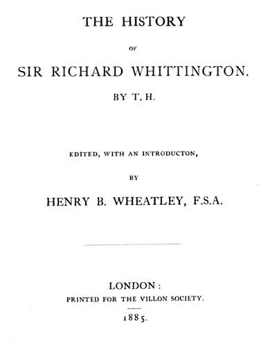 “London’s Glory and Whittington’s Renown, or a Looking Glass for Citizens of London, being a remarkable story how Sir Richard Whittington (a poor boy bred up in Lancashire) came to be three times Lord Mayor of London in three several kings’ reigns, and how his rise was by a cat, which he sent by a venture beyond sea. Together with his bountiful gifts and liberality given to this honourable City, and the vast sums of money he lent the King to maintain the wars in France; and how at a great Feast, to which he invited the King, the Queen, and the Nobility, he generously burnt the writings and freely forgave his Majesty the whole Debt. Tune of ‘Dainty, come[xv] thou to me.’ London: Printed for R. Burton, at the Horse Shoe in West Smithfield.”