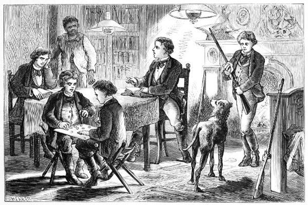 It is the night of the first of December, 18—. The boys’ room is brilliantly illuminated by four large lamps suspended from the ceiling, and a cheerful wood fire is burning on the hearth, and around it is gathered a happy party consisting of[32] all the members of the Sportsman’s Club. That broad-shouldered, sturdy-looking fellow who is sitting on one side of the centre-table with a book on his knee, and talking to the old negro who stands with his hand on the door-knob, is Walter Gaylord, the President of the Club. He and his companions have been discussing various plans for their amusement, and having decided to pass the next day in hunting coons, Walter is issuing his orders. “You’re sure the weather will be favorable, are you, Sam?” he asks.