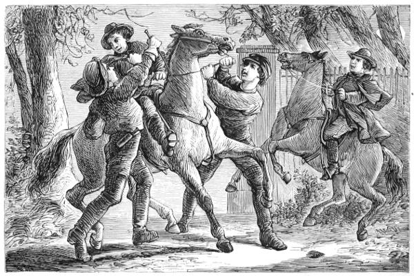 About a hundred yards further up the bank, to the left of the boat-house, were the stables where Mr. Gaylord kept his riding and some of his farm-horses, and the kennels which afforded shelter to his hounds. Horses and hounds were made much of in those days, and Mr. Gaylord and his brother, Uncle Dick, took as much pride in theirs as any old English huntsman. Walter and Eugene were well provided for in this particular, and their saddle-nags and dogs were the envy of all the young hunters in the parish. Walter rode a large, milk-white charger, which was like his master in more respects than one. He was as steady as a plough-horse, afraid of nothing, was generally very deliberate in his movements, and on ordinary occasions went along at a snail’s pace, his head down, his eyes half-closed, and his ears bobbing back and forth with every step he made. But, after all, there was plenty of spirit in him. Let him once hear the hounds in full cry, or let his rider tighten the reins and give him even the slightest touch with the spur, and the old horse’s head would come up, and he would step off in a way that made it[15] exceedingly difficult for any but a fleet-footed nag to keep pace with him. Eugene’s horse was a different sort of animal altogether. He was a small, light-bodied roan, fiery and vicious, and so restless that he never would stand still long enough for his rider to become fairly seated in the saddle. But the two got along very well together. The horse always wanted his own way, and Eugene was quite willing that he should have it.