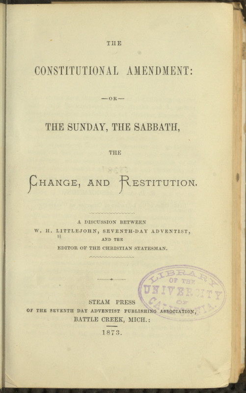 Title: The Constitutional Amendment: or, The Sunday, the Sabbath, the Change, and Restitution