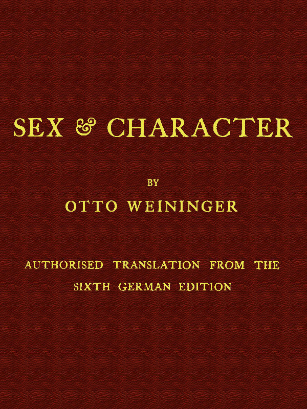 This book is an attempt to place the relations of Sex in a new and decisive light. It is an attempt not to collect the greatest possible number of distinguishing characters, or to arrange into a system all the results of scientific measuring and experiment, but to refer to a single principle the whole contrast between man and woman. In this respect the book differs from all other works on the same subject. It does not linger over this or that detail, but presses on to its ultimate goal; it does not heap investigation on investigation, but combines the psychical differences between the sexes into a system; it deals not with women, but with woman. It sets out, indeed, from the most common and obvious facts, but intends to reach a single, concrete principle. This is not “inductive metaphysics”; it is a gradual approach to the heart of psychology.