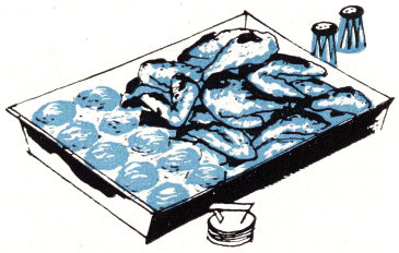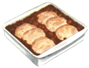 Make Biscuits (p. 3). Turn chicken and push to one side in pan; set biscuits in single layer on other side. Bake another 15 min., or until biscuits are lightly browned and chicken tender. 4 servings.