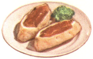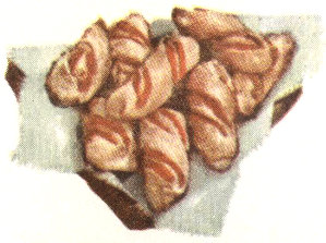 Different and delicious. (Pictured on inside of back cover.) Make Biscuit dough (p. 3). Roll into 10x6″ rectangle. Cut in half lengthwise. Cut each half into 12 strips. Melt ⅓ cup butter; pour half of it into 13x9½x2″ oblong pan. Place strips in pan. Pour remaining butter over tops. Bake.