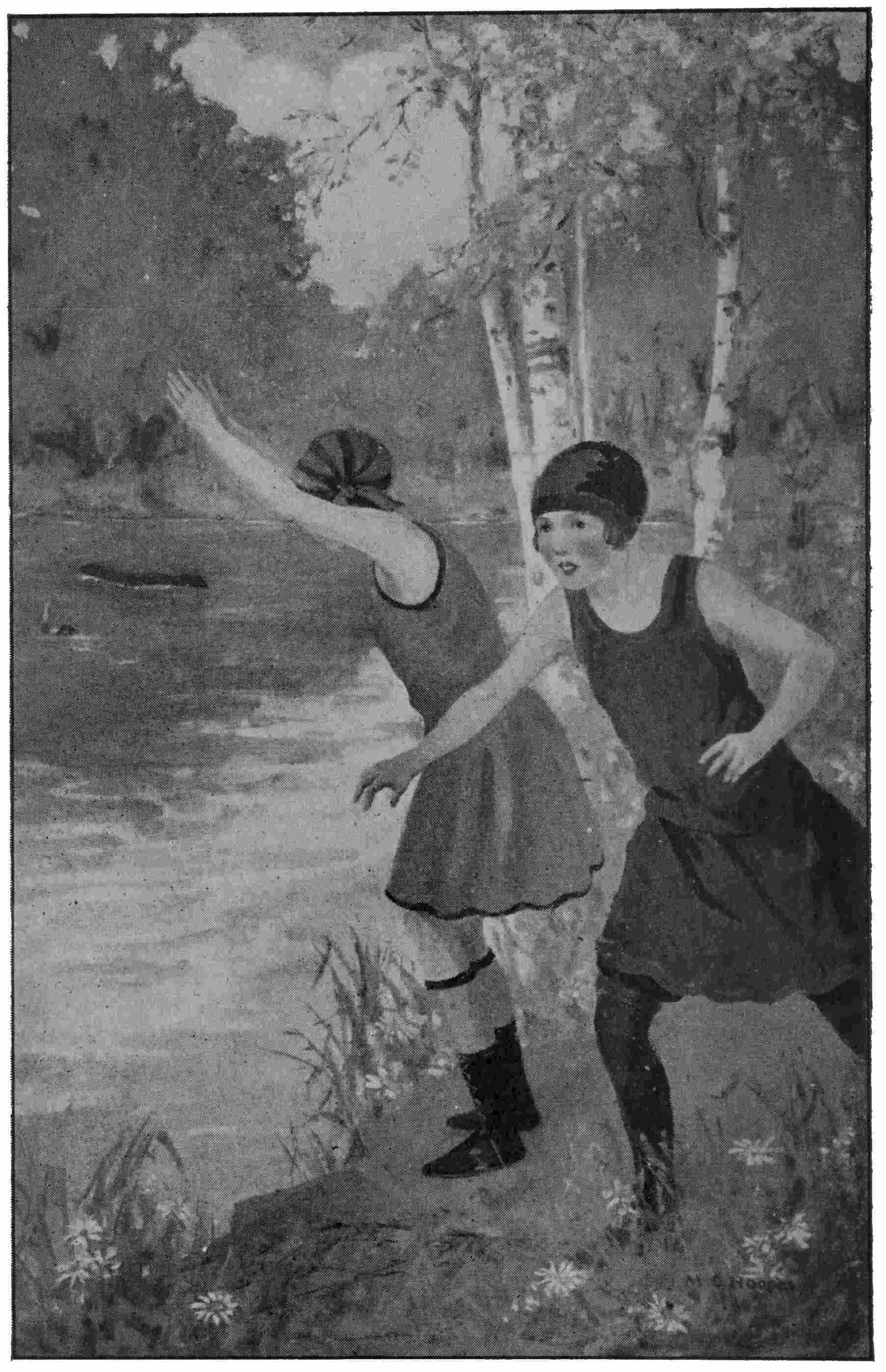 “Look out, there!” cried Philip suddenly, and he reached out a hand to pull Lilian toward the car. She had gotten out on the side next the road and was gathering together some of their wraps and packages. With one wild honk, a car whizzed around the corner, balanced on its outer wheels, continued a little further and stopped. It was a large car like their own, with only one occupant, a man who was having trouble with his engine. It puffed and snorted for a while, but the girls and Philip did not wait to see the outcome when they saw that the car had not turned over. With their lunch, and various comforts in the way of robes and wraps to sit on, they pursued their way toward the woods, after Philip had closed and locked the car.