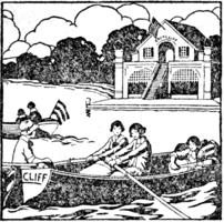 The boys, who had been standing aside, though listening with interest to the conversation, were introduced and soon hurried off, while Mrs. Van Buskirk went down to the dock, to which she had been directed, and sat down on a long bench there, with people who were waiting for some boat. Presently she saw the boats from Merrymeeting Girls’ Camp, which she recognized because of their load of happy girls, and walked across the muddy driveway toward the floating dock, where she saw that they were about to land. Her first glimpse of her daughter Cathalina came when the girls began to disentangle themselves from mass formation, and Cathalina jumped out, shaking out the wrinkles in her dress and tucking back wisps of hair which had been blown about by the Kennebec breezes.