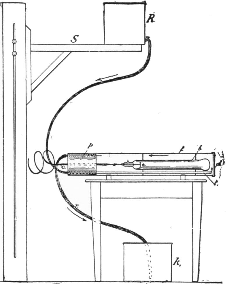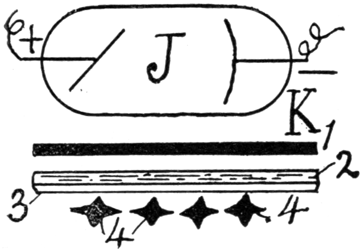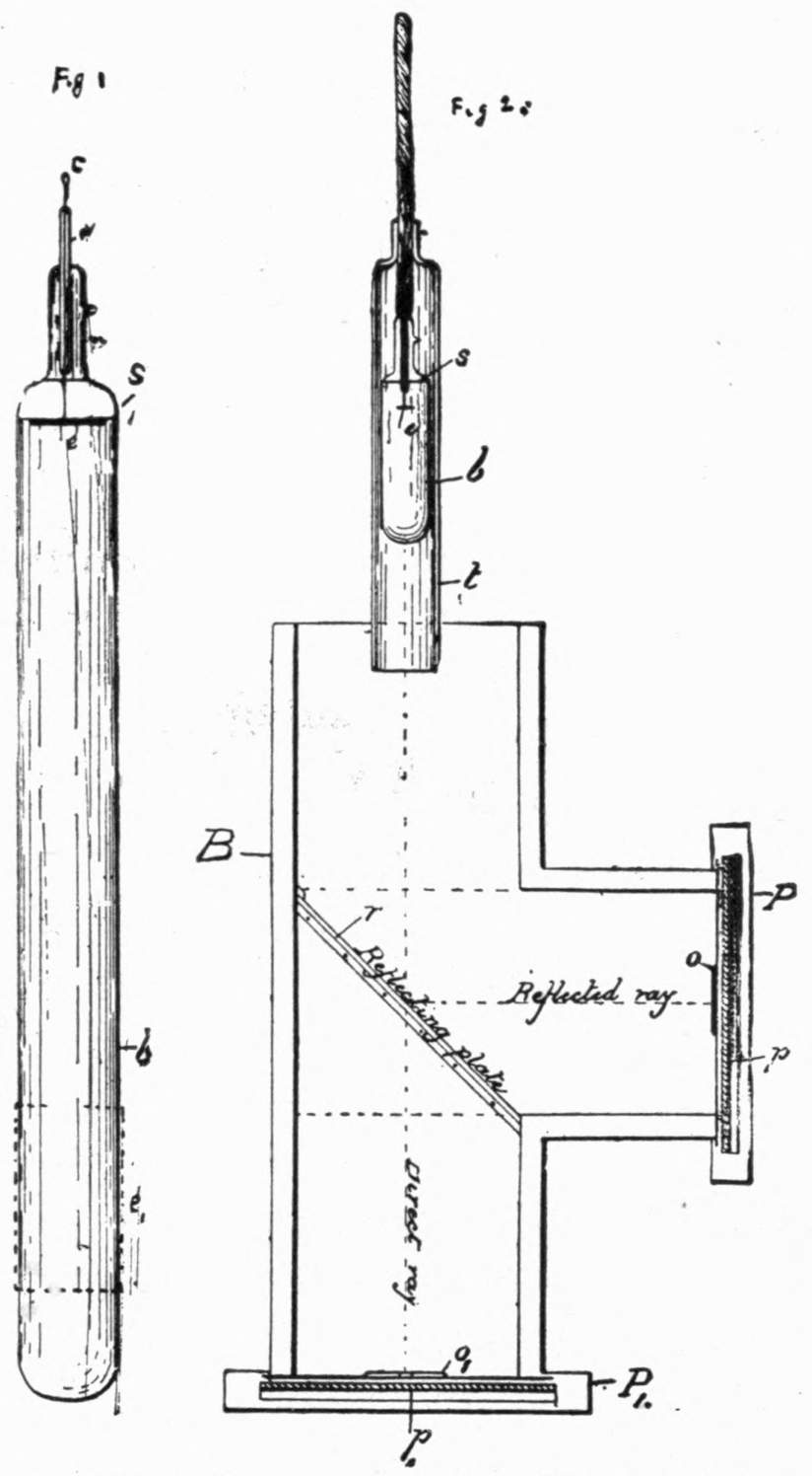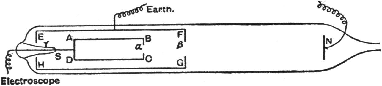 In view of the tremendous amount of experimenting which has been carried on during the past few years in connection with the electric discharge, it was difficult to determine just how far back to begin (without starting at the very beginning), so that the student and general reader, whose object is to become acquainted especially with the properties of cathode and X-rays, might better understand them. The author realized that it was necessary to go back further and further in this department of science, and he could not easily stop until he had reached certain investigations of Faraday, Davy, Page, and others, which are briefly noticed in an introductory sense. Take, for example, the inaction of the magnet upon X-rays in open air. § 79. Of course, it would be of interest for the student to know about Lenard’s investigations relating to the action of the magnet upon cathode rays inside of the observing tube. § 72a. It would follow, further, that he would desire to know about Crookes’ experiment relating to the attraction of the magnet upon cathode rays within the tube. § 59. In order that he might not infer that Crookes was the first to investigate the action of the magnet upon the discharge, it was evident that the book could be made of greater value by relating the experiments of Prof. J. J. Thomson as to the discharge across and along the lines of magnetic force, § 31, and Plücker’s experiment on the action of the magnet upon the cathode column of light. § 30. The interest became increased, instead of diminished, by noting De la Rive’s experiment on the rotation of the luminous effect of the discharge by means of the magnet. § 29. Being now quite impossible to stop, Davy’s electric arc and magnetic action upon the same had to be alluded to, at least briefly. § 28. On the other hand, the very earliest experiments with the discharge in rarefied air are not described—occurring as remotely as the eighteenth century—so ably treated of in Park Benjamin’s work. Those facts that have some mutual iiibearing are brought forward to serve as stepping-stones to the investigation of cathode and X-rays.