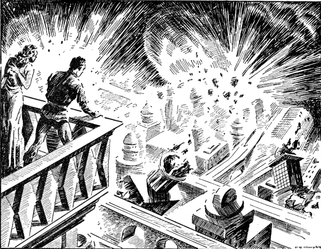 My last day on Earth was ended. I had opened my eyes. I saw first that some miracle of science had reconstructed the burned away half of my right arm. Then I noticed the woman. I was sitting bolt upright in an instant on the smooth metal table. The little man with his strange "Buck Rogers" dress was looking quietly at me. And she was looking at me, too, out of slitted lids that veiled all the women of the ages in subtly yet violently burning eyes.