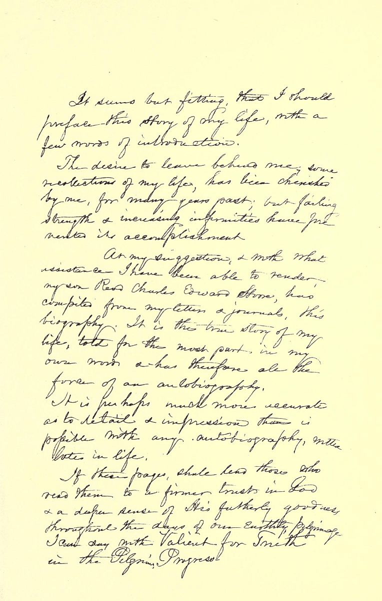At my suggestion and with what assistance I have been able to render, my son, Ross Charles Edward Stowe, has compiled from my letters and journals, this biography. It is this true story of my life, told for the most part, in my own words and has therefore all the force of an autobiography.